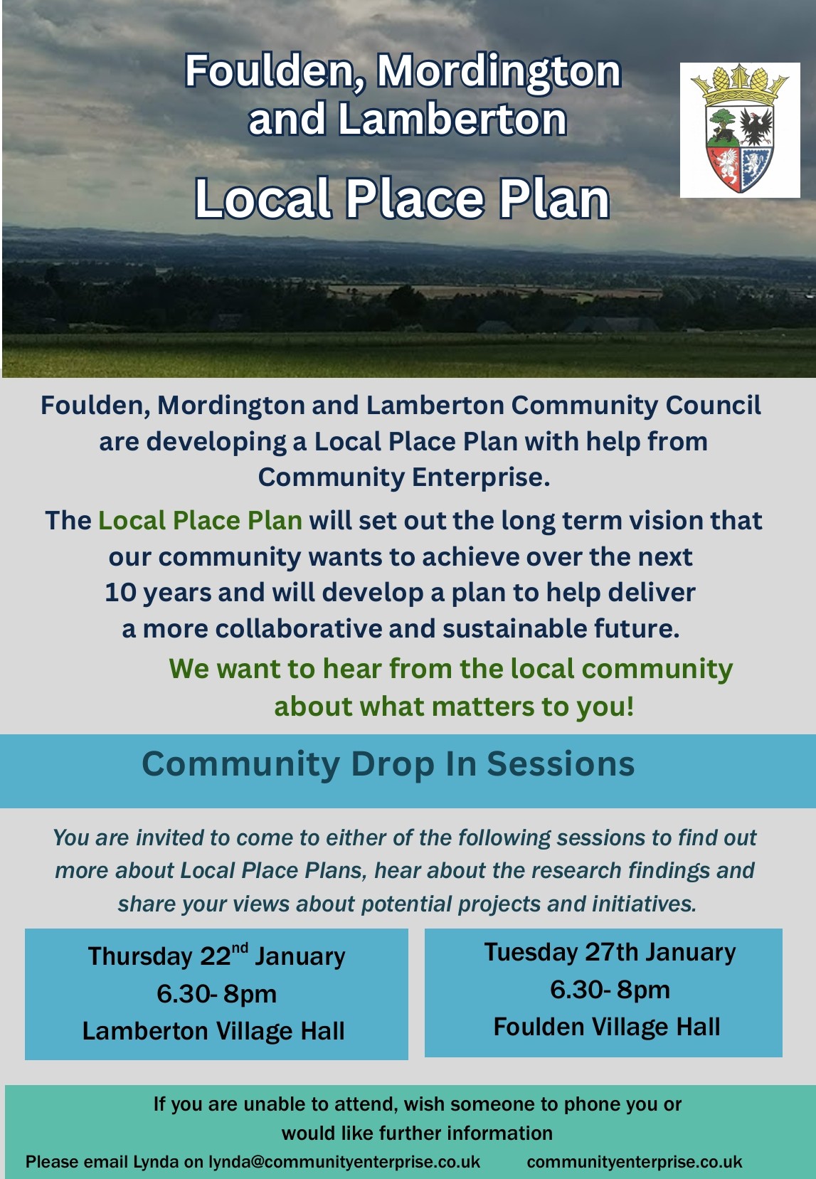 The Community Council meets formally every two months, either at Foulden Village Hall, or Lamberton Village Hall. The open forum starts at 6.30pm, which all members of the community are invited to should they wish to raise, or discuss anything which the Community Council might be able to help with.